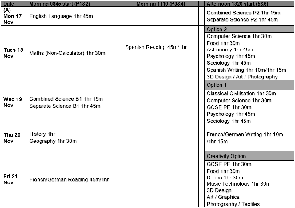 Black Pens only and at least one spare, a scientific calculator, a 30cm ruler, a rubber and sharp pencils etc. Tippex is not allowed. Check the timetable with your subject teacher. All equipment needs to be carried in a see-through pencil case or plastic bag.