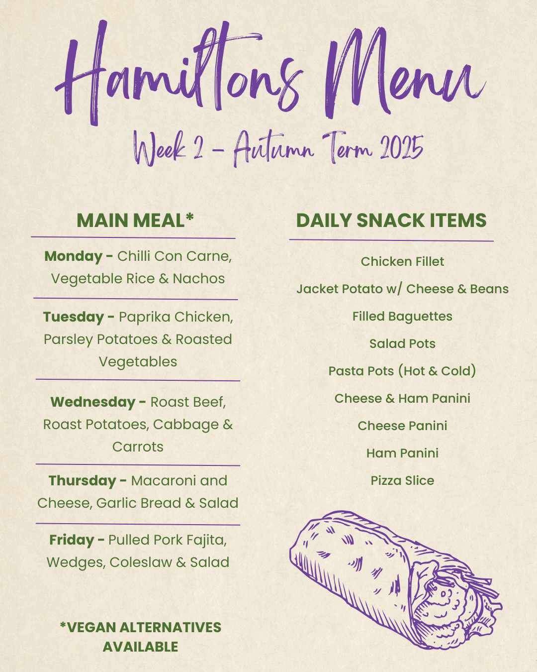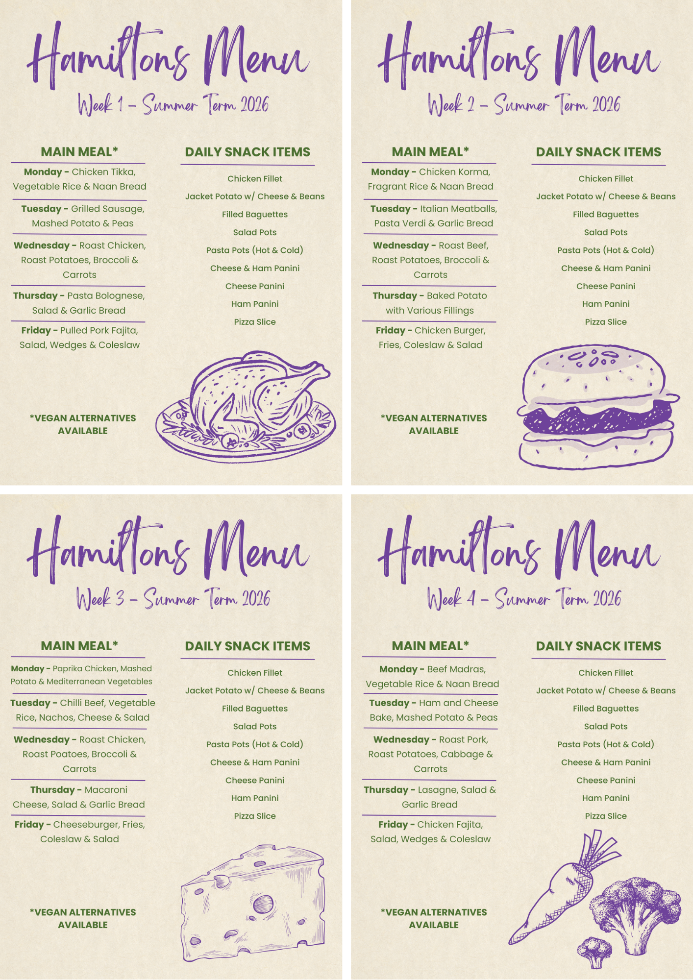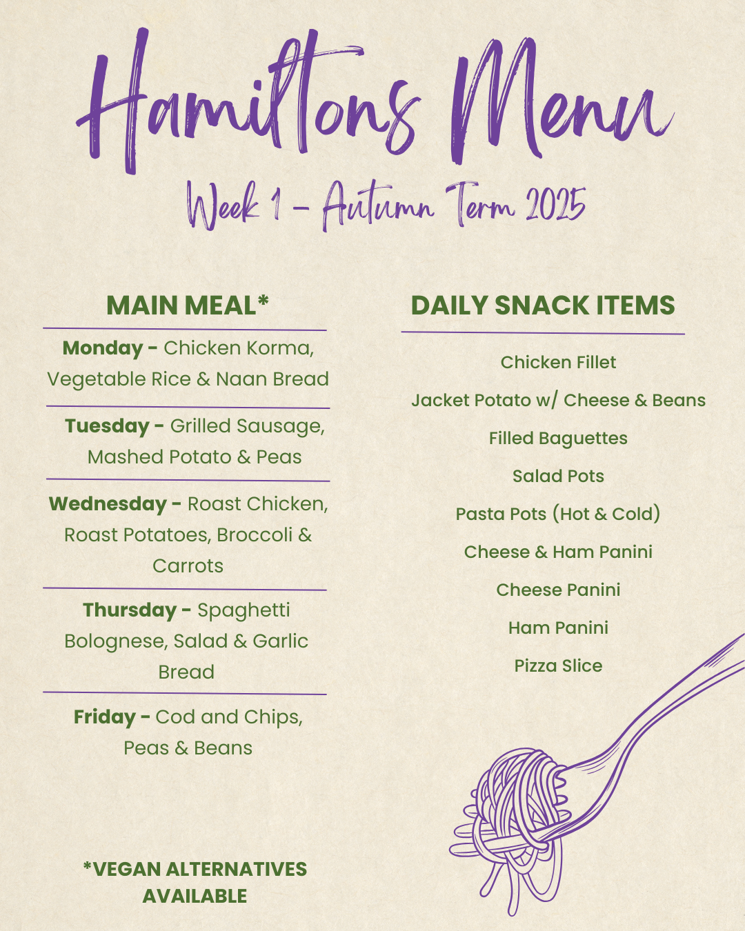 Led by our Catering Manager, Hamiltons provide a breakfast, break and lunchtime service. Students can choose from a varied menu, which meets the governments ‘Healthy Schools’ agenda, the nutritional information guidelines and the schools Fairtrade policy.