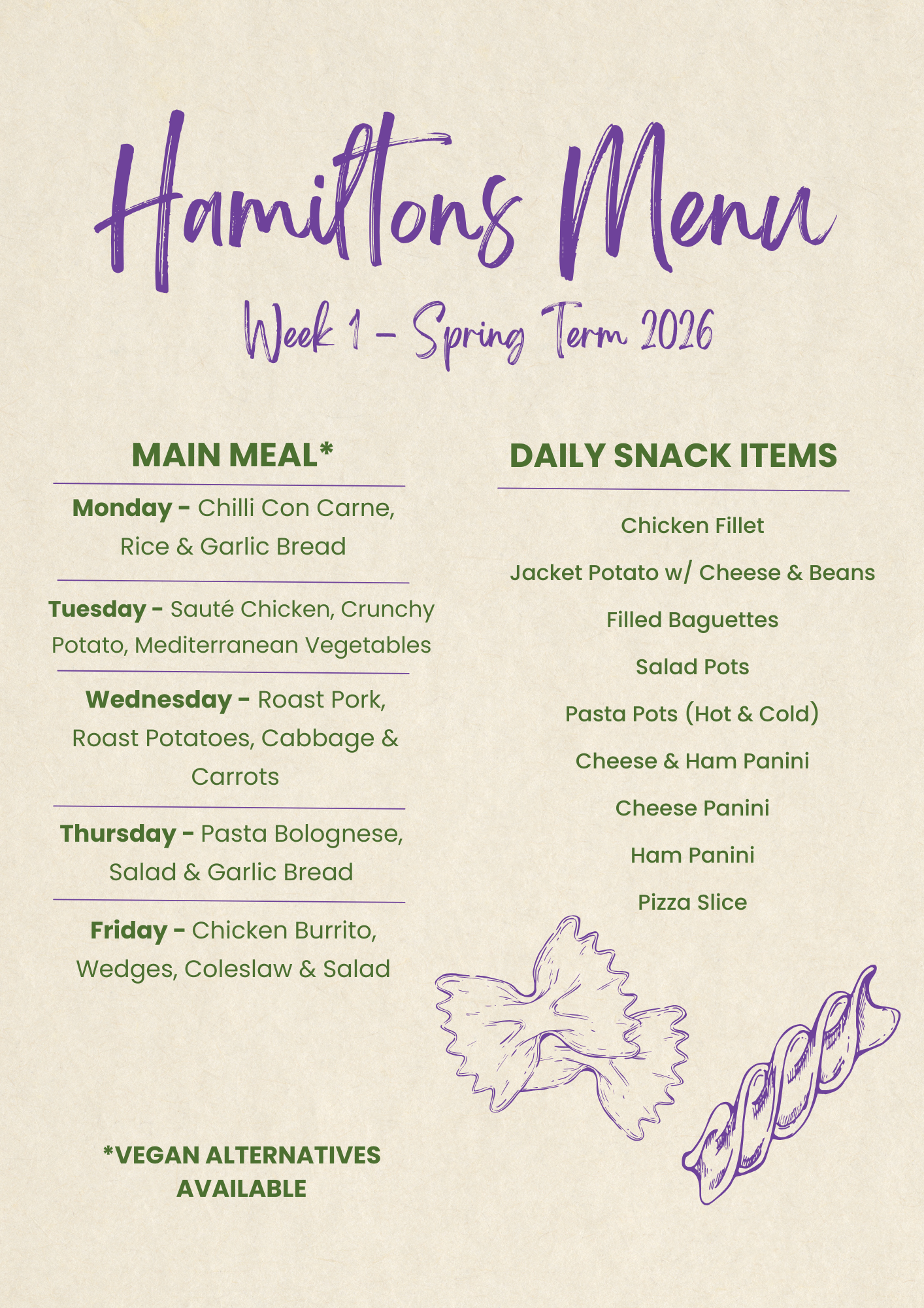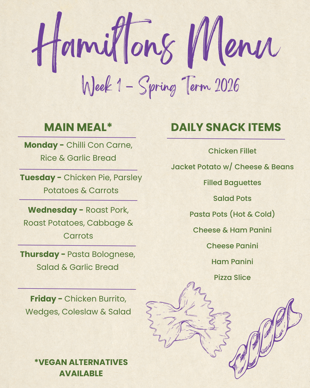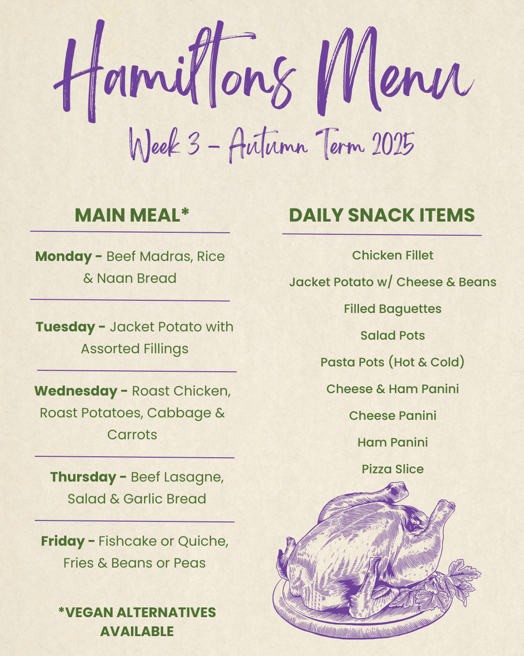 Led by our Catering Manager, Hamiltons provide a breakfast, break and lunchtime service. Students can choose from a varied menu, which meets the governments ‘Healthy Schools’ agenda, the nutritional information guidelines and the schools Fairtrade policy.