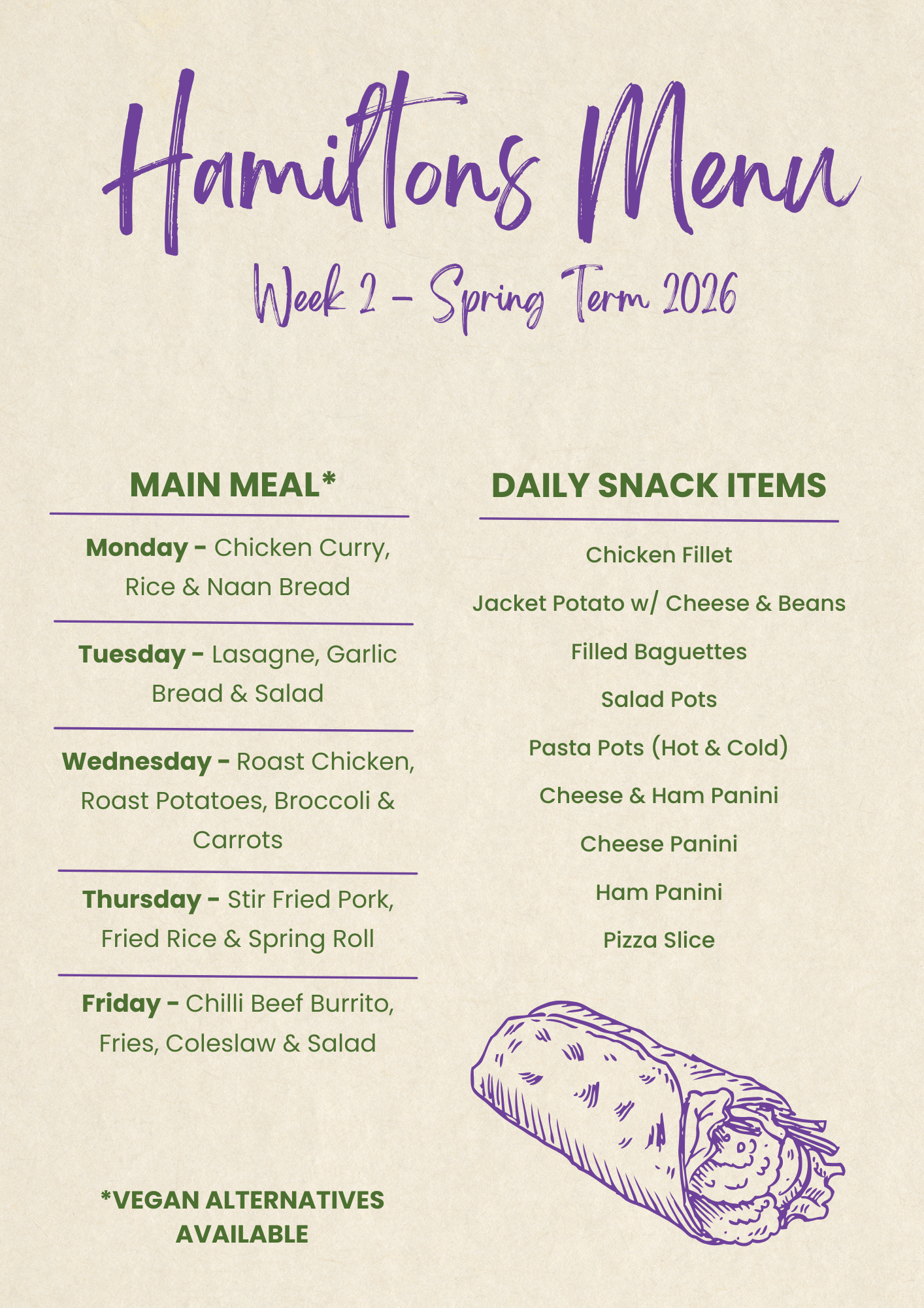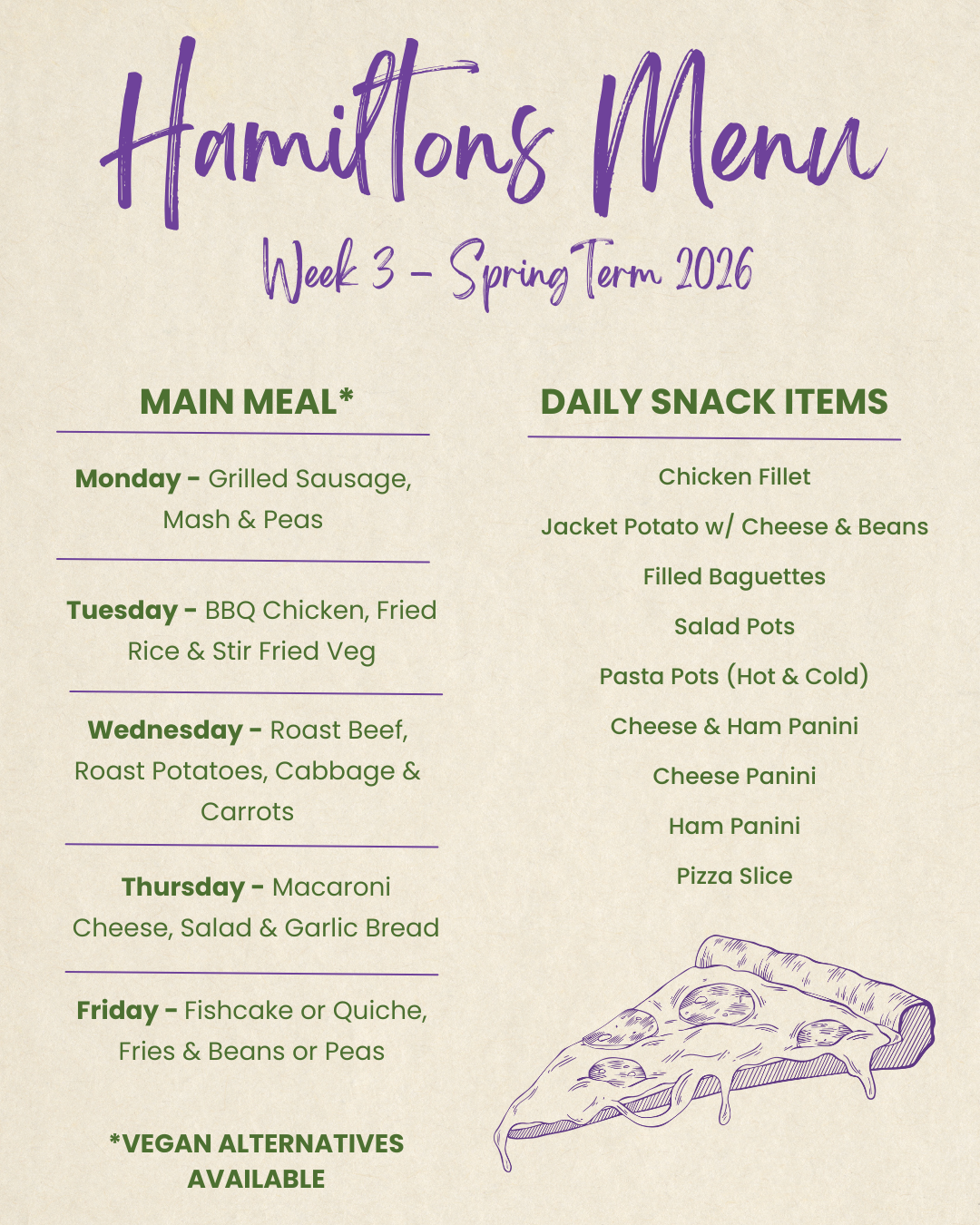 - The main servery is open for breakfast, snacks at break and hot meals at lunch time.