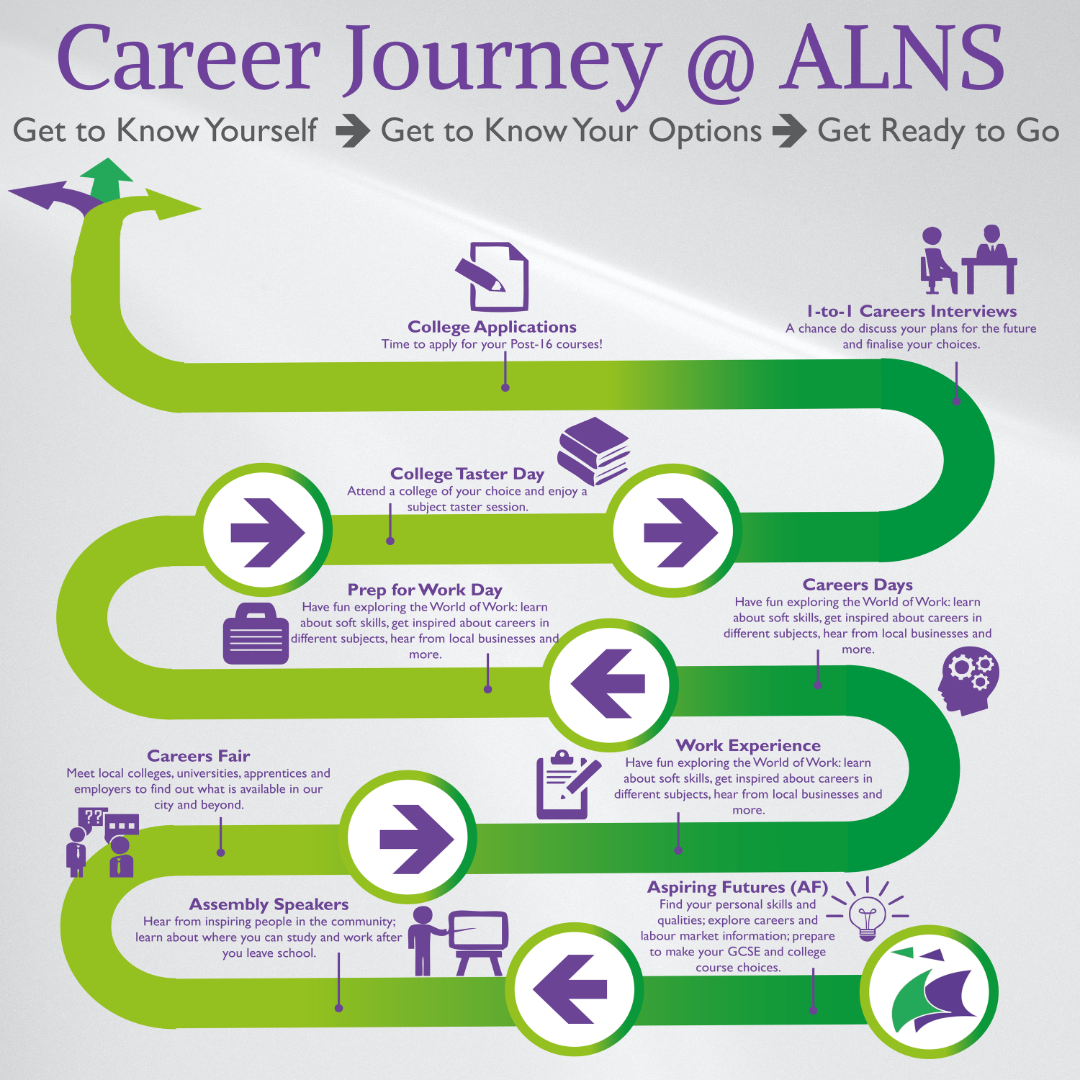 There is support for all students as they consider their life aspirations, and it is available throughout their time at ALNS. Specific careers lessons take place during “Aspiring Futures” (AF) lessons throughout each year and all students will have the chance to participate in Personal Development (PD) days each half term, with specific focus on their future choices.