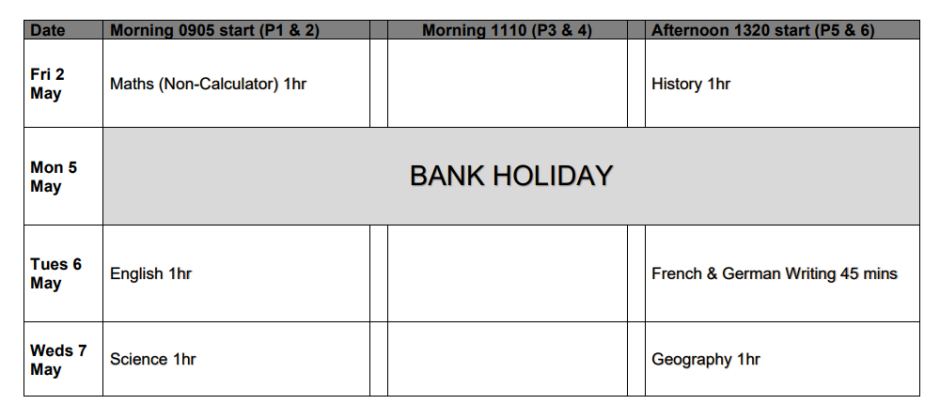 No bags/coats etc. are to be brought into the Sports Hall prior to your exams (these must be left in your locker). If bags/coats are left outside the Exam room we cannot be held responsible for any loss.