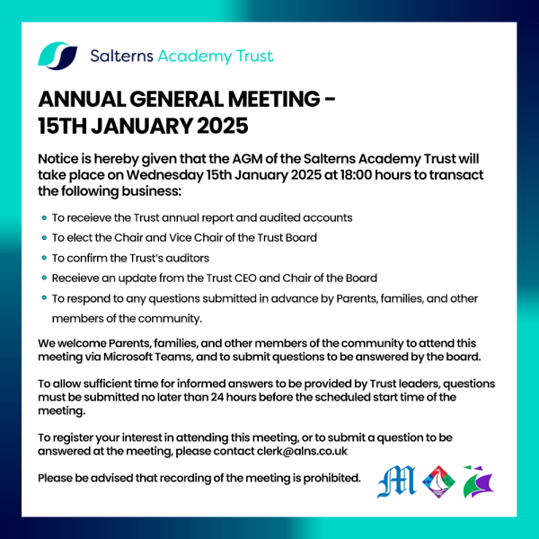 Notice is hereby given that the AGM of the Salterns Academy Trust will take place on Wednesday 15th January 2025 at 18.00 hours to transact the following business: