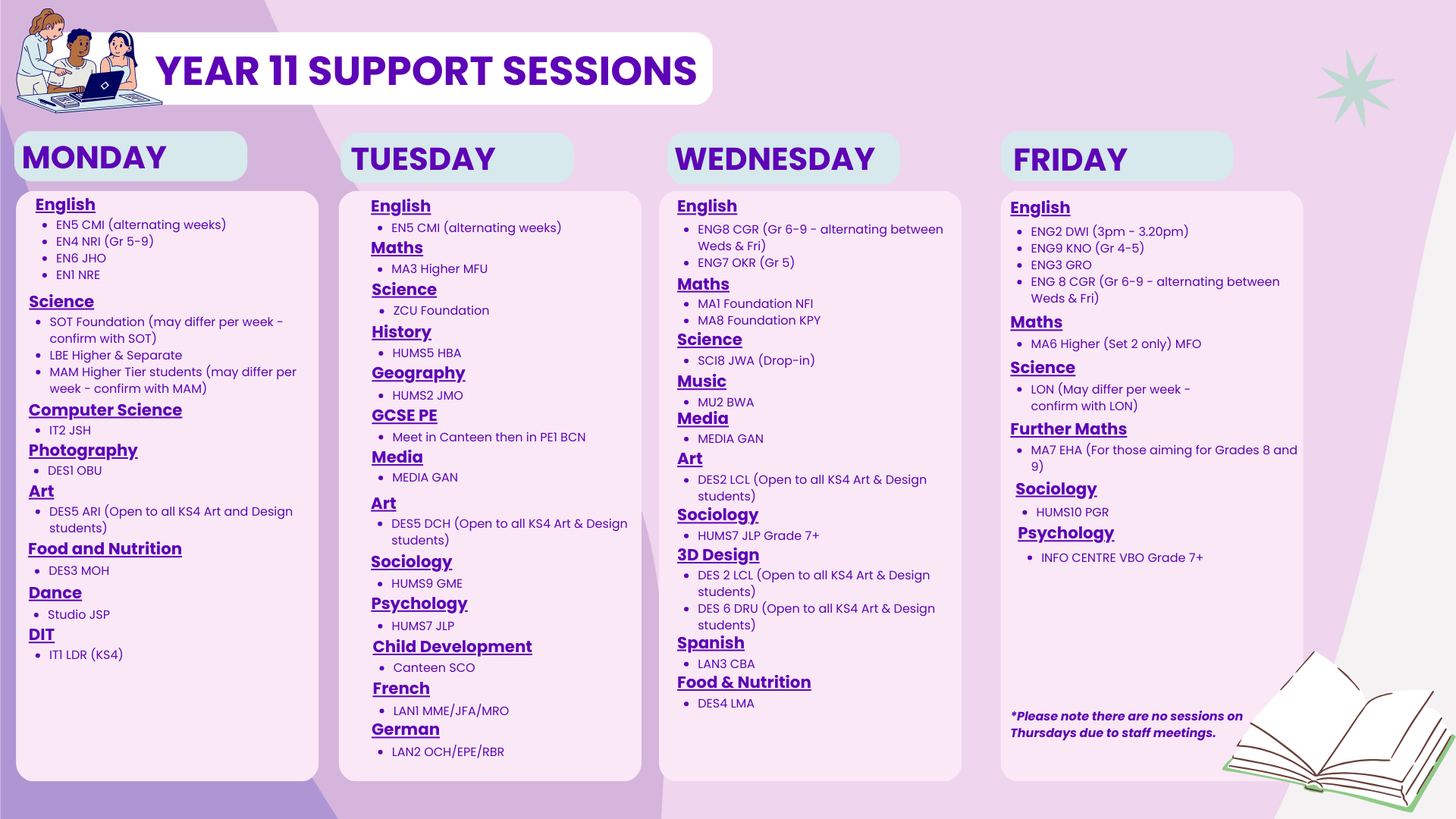 To support our Year 11 students in preparation for their Mock Examinations in February and their final examinations in May/June, we have put together a timetable of after-school Support Sessions.