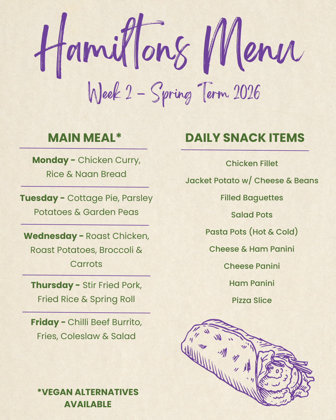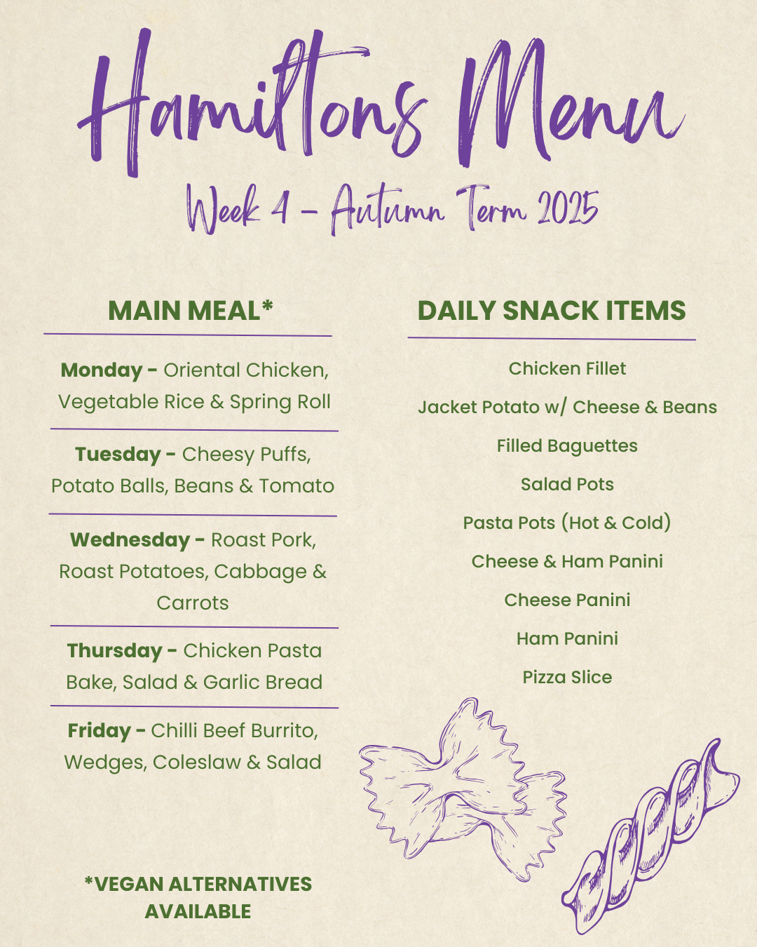 Led by our Catering Manager, Hamiltons provide a breakfast, break and lunchtime service. Students can choose from a varied menu, which meets the governments ‘Healthy Schools’ agenda, the nutritional information guidelines and the schools Fairtrade policy.