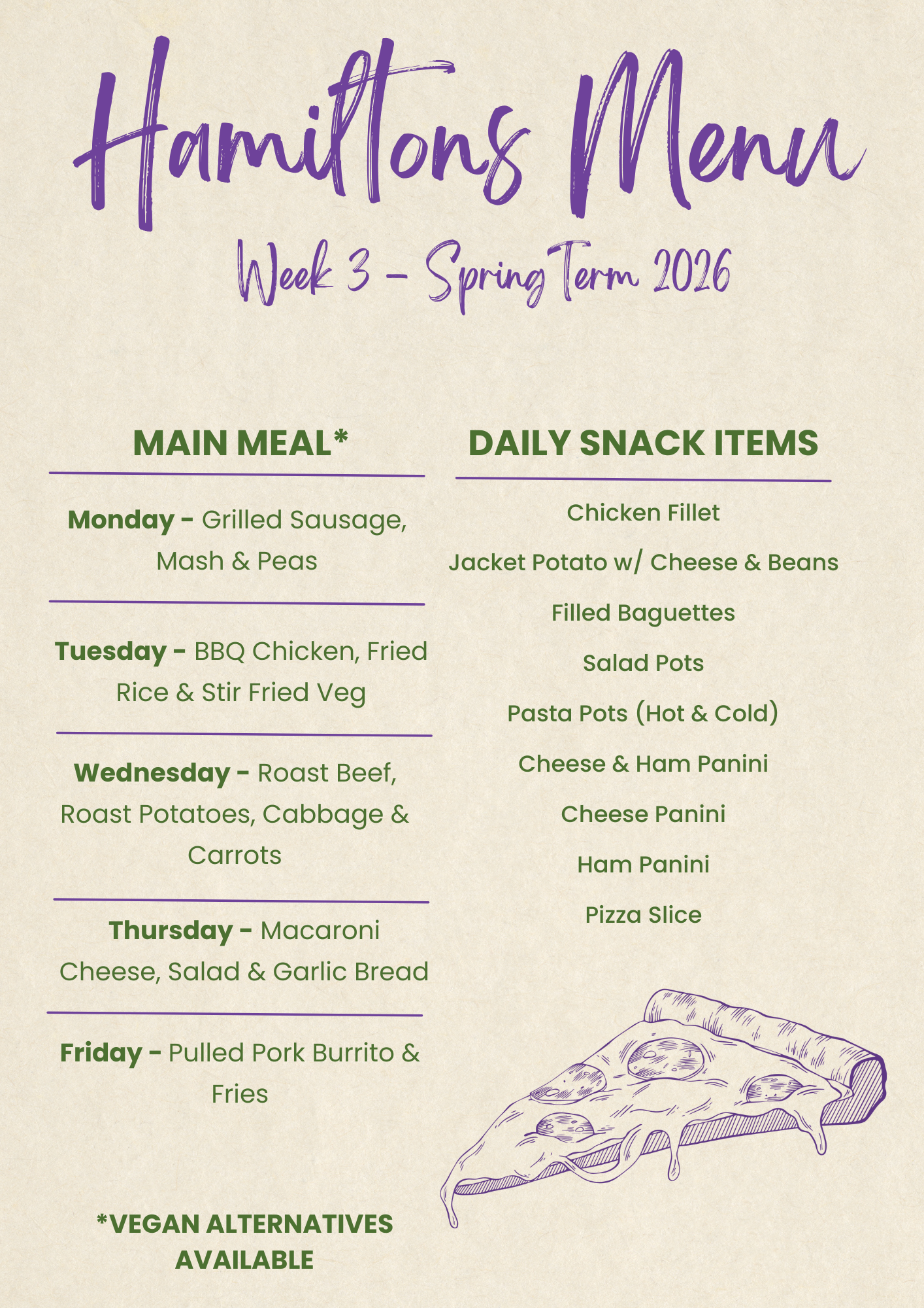 - The main servery is open for breakfast, snacks at break and hot meals at lunch time.