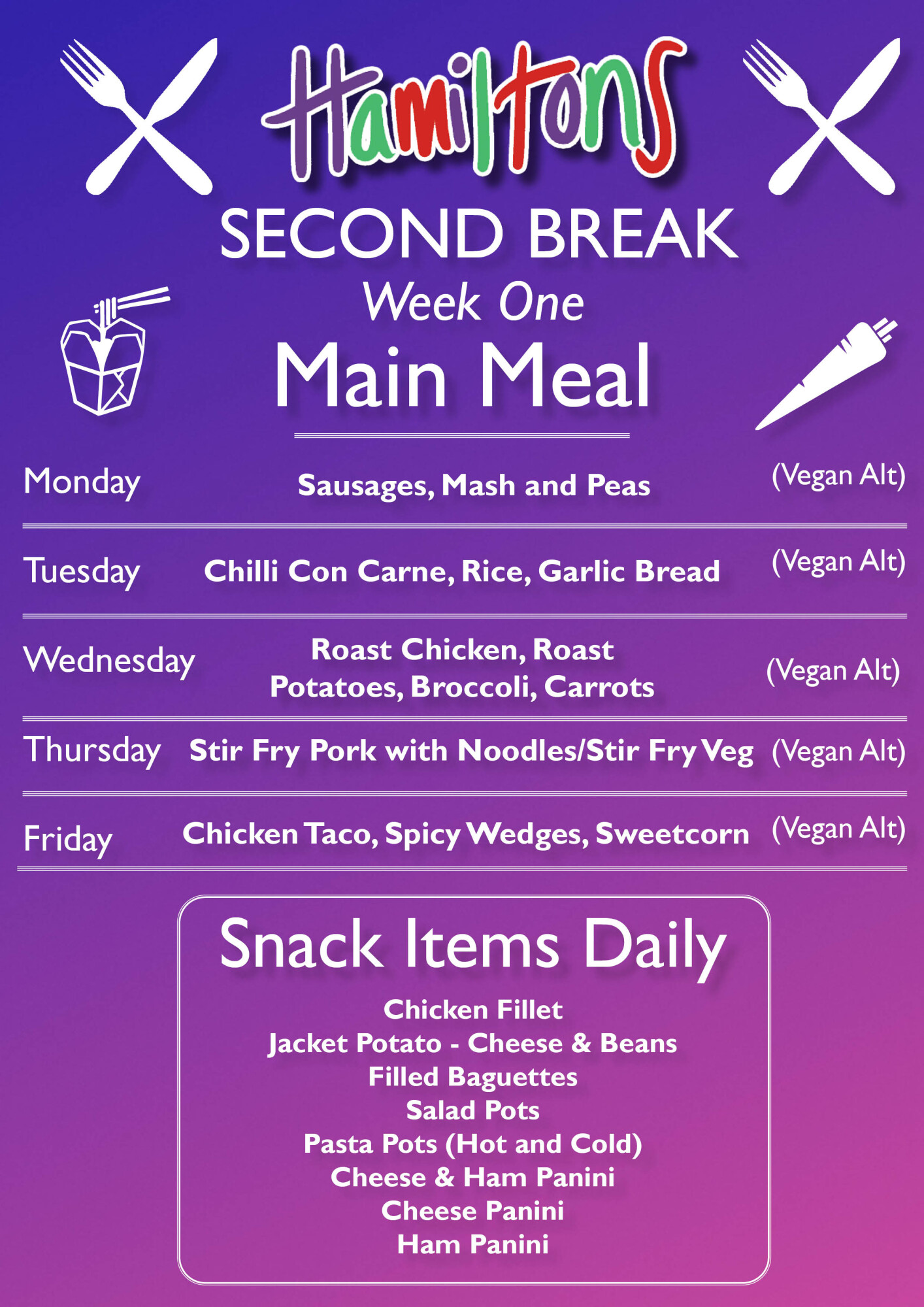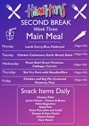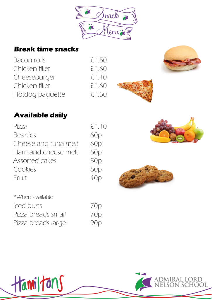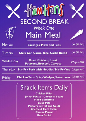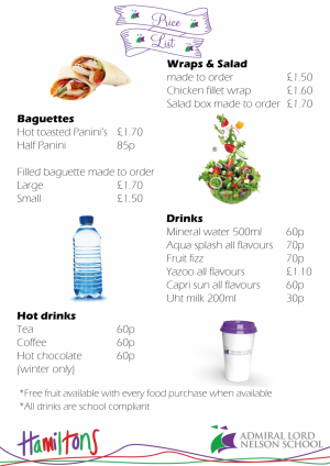 Led by our Catering Manager, Hamiltons provide a breakfast, break and lunchtime service. Students can choose from a varied menu, which meets the governments ‘Healthy Schools’ agenda, the nutritional information guidelines and the schools Fairtrade policy.