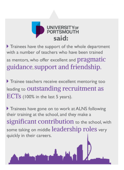 ALNS provides our trainee teachers with a welcoming and professional learning environment in which they thrive. Mentors are committed to their professional development, they support and challenge trainees in exactly the right way.